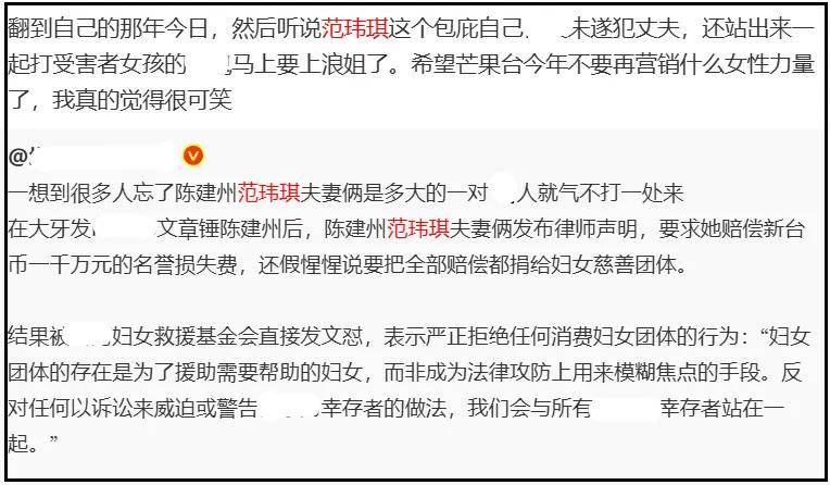 在抵制网友看来,抵制范玮琪并不是苛责女性,是因为她和陈建州是利益共同体,夫妻俩联手用官司对受害者施压,用金钱和权势去霸凌受害者,胁迫受害者闭嘴。